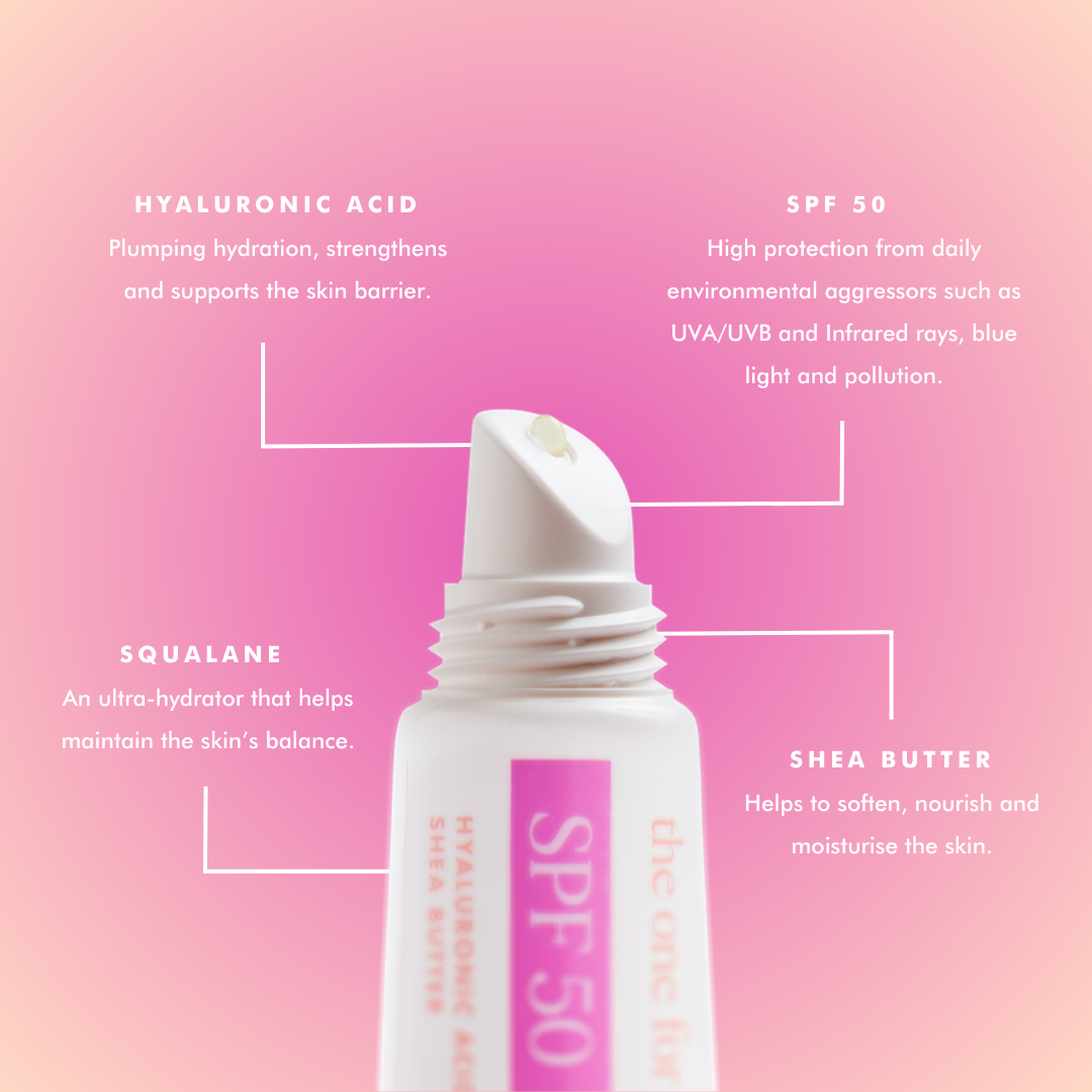 Serum SPF50: A featherlight, multitasking serum with Hyaluronic Acid and Vitamin C, designed to hydrate and protect your skin from premature aging and environmental stressors, leaving your complexion fresh and glowing, no matter the season.