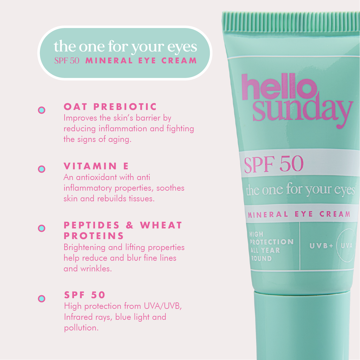 Advanced eye protection with 100% mineral filters, tested under dermatological and ophthalmological control. Designed to brighten, lift and protect the eye area. A rich mix of hydrolysed proteins and biomimetic peptides to tighten and lift the eye area along with giving a brightened appearance. Infused with microbiome-friendly oatmeal prebiotics that hydrate, calm and illuminate. Advanced protection with 100% mineral and antioxidant filters protecting the eyes from UV damage.
